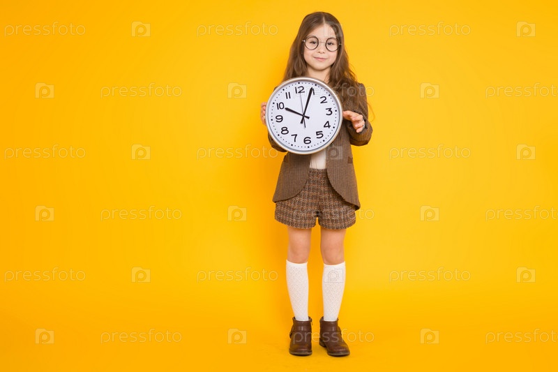Портрет очаровательной длинноволосой маленькой девочки в очках в коричневой куртке, шортах и белых гольфах с часами, изолированными на оранжевом фоне с копирайтом школы или концепцией времени продаж