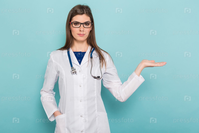 Привлекательная женщина-врач в белом халате и очках
