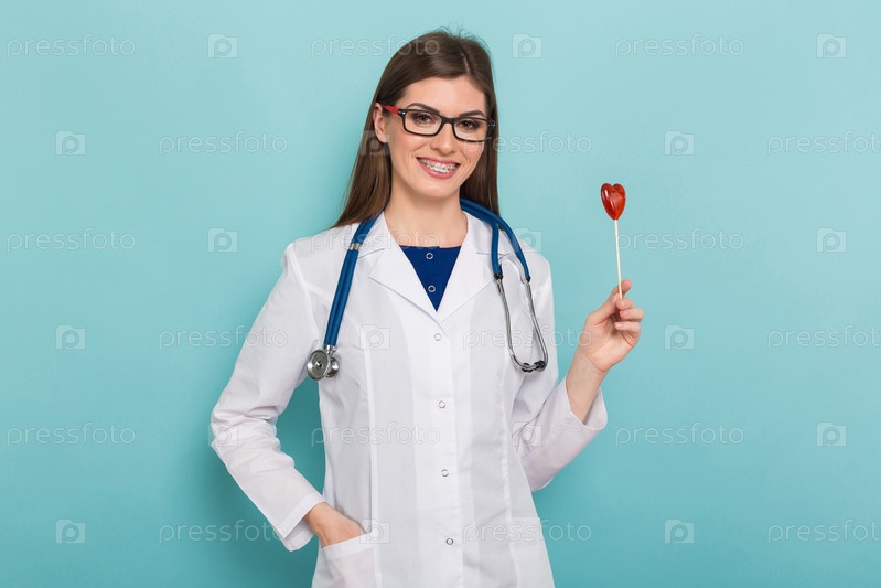Женщина-врач в белом халате и очках с брекетами на зубах носит стетоскоп и держит леденец в форме сердца, изолированный на синем фоне с копирайтом