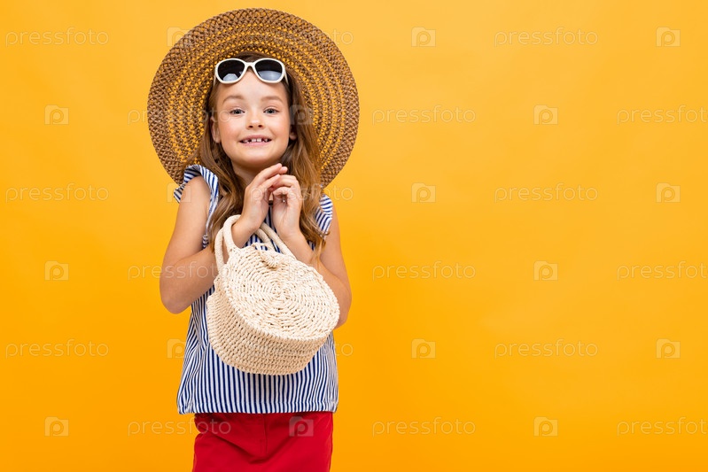 Портрет очаровательной гламурной красивой девушки в соломенной шляпе и очках на желтом фоне