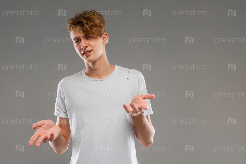 Сомневающийся парень в белой футболке с рисунком на сером фоне