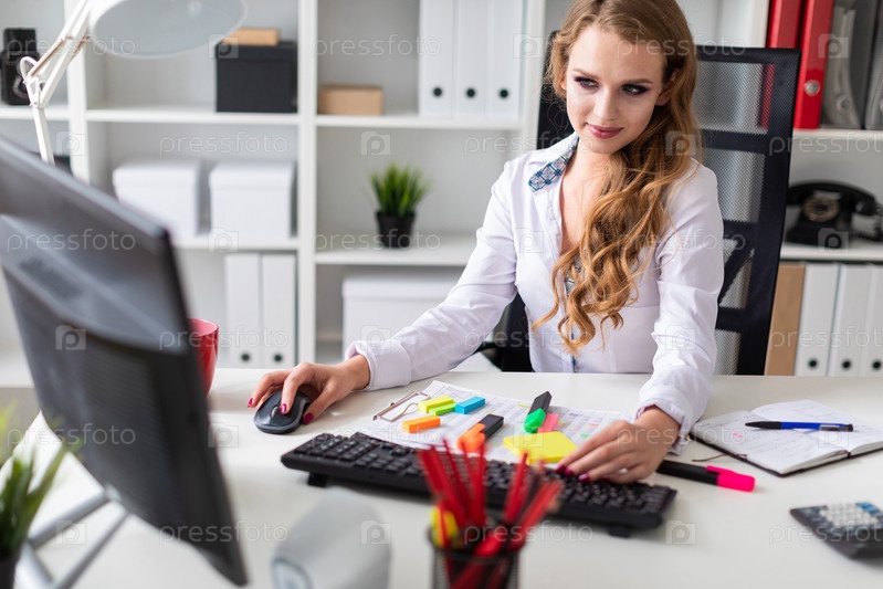 В офисе работает молодая блондинка в белой блузке. фото с глубиной резкости