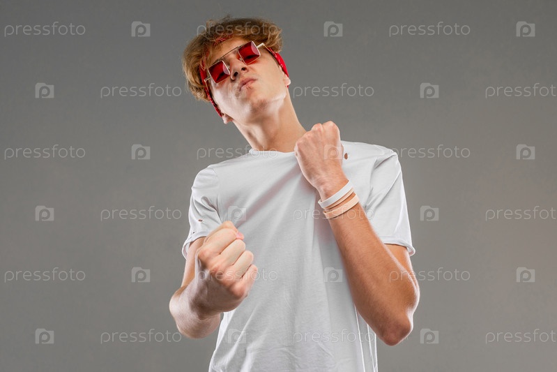 Красивый эмоциональный мальчик-подросток позирует в студии на фоне серого