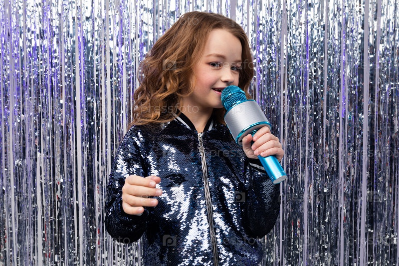 Привлекательная кавказская девушка с микрофоном на фоне мишуры