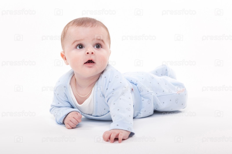 Ребенок в теле лежит на животе на белом фоне и