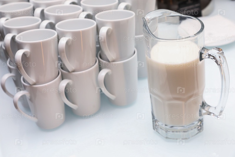 Стеклянный кувшин с белой жидкостью и пустые чашки белого чая стоят на столе. Бокал пива с молоком и пирамидкой чашек