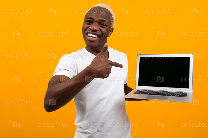 Африканский мужчина с белыми волосами улыбается, держа экран ноутбука вперед с макетом, указывающим на экран на желтом фоне