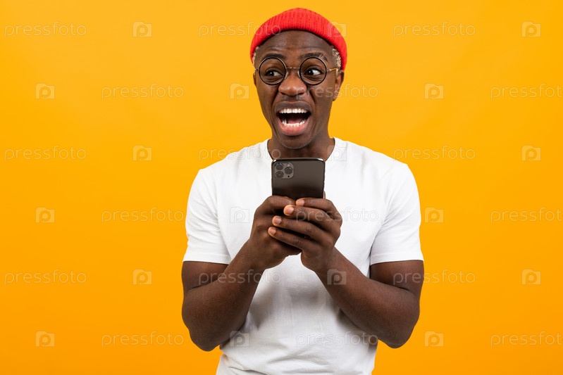 Американец очень удивлен, держа смартфон в руках и глядя в сторону на желтом фоне с копией пространства