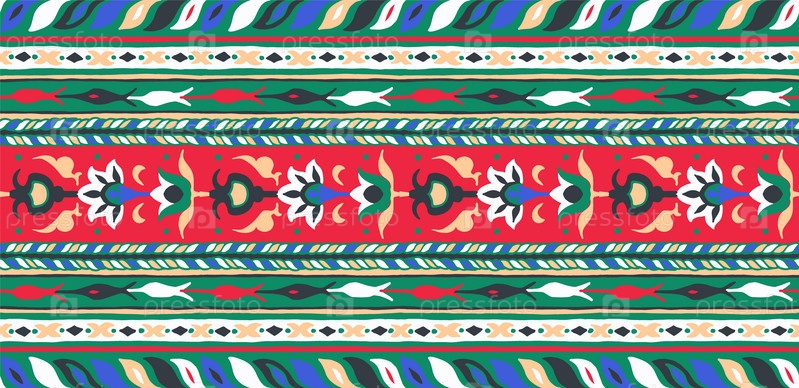 Геометрический фольклорный орнамент икат. Племенная этническая векторная текстура. Бесшовный полосатый узор в стиле ацтеков. Рисунок племенной вышивки. Индийский, скандинавский, цыганский, мексиканский, народный узор