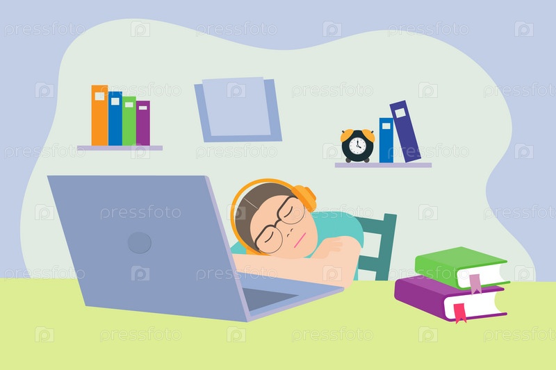 Девушка в наушниках спит за столом с ноутбуком