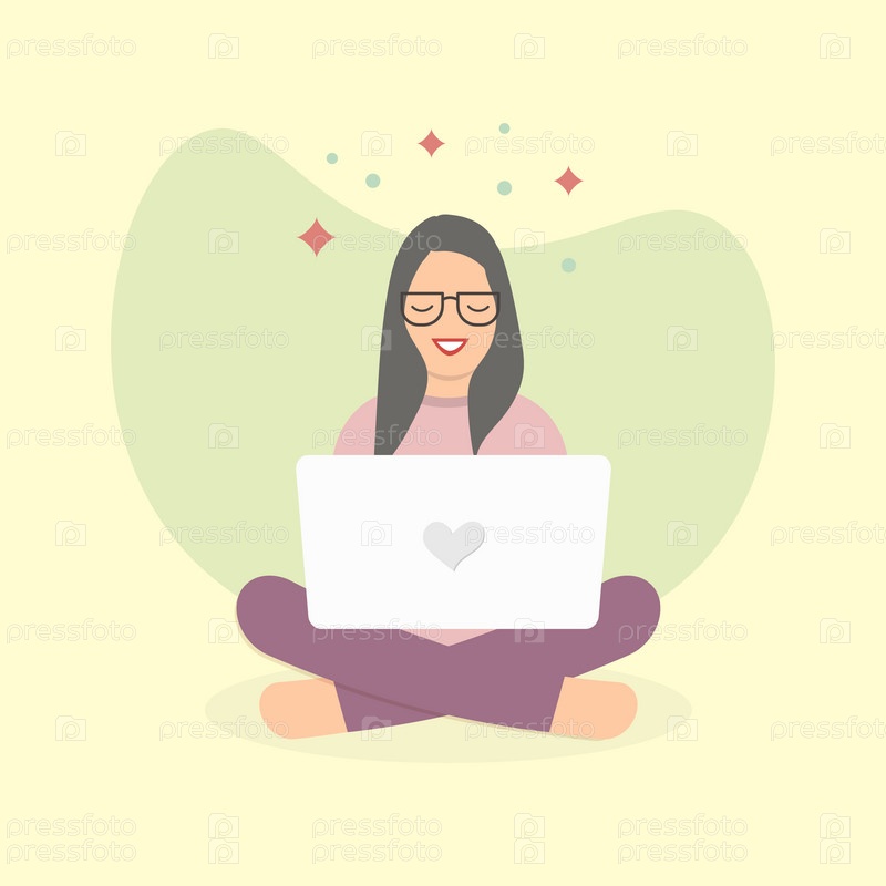 Молодая женщина с ноутбуком сидит в позе лотоса