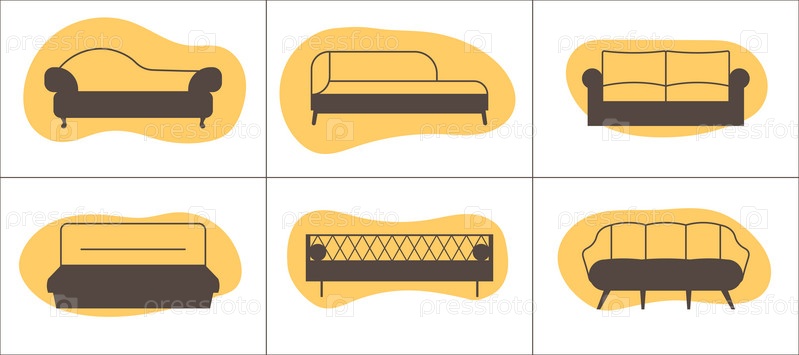Шесть мебельных иконкок диванов на абстрактных фигурах-подложках