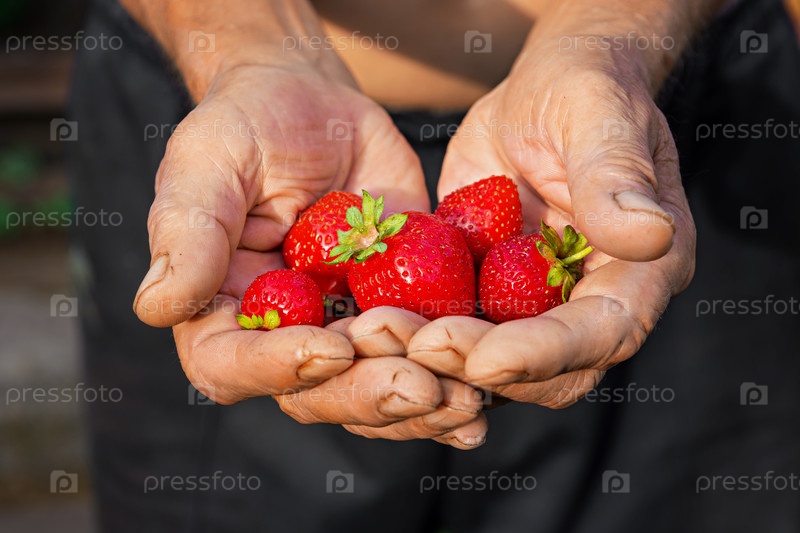 Пожилой мужчина-фермер собирает спелую клубнику. горсть ягод в руках. Сбор свежей органической клубники. Руки фермера, собирающего клубнику крупным планом