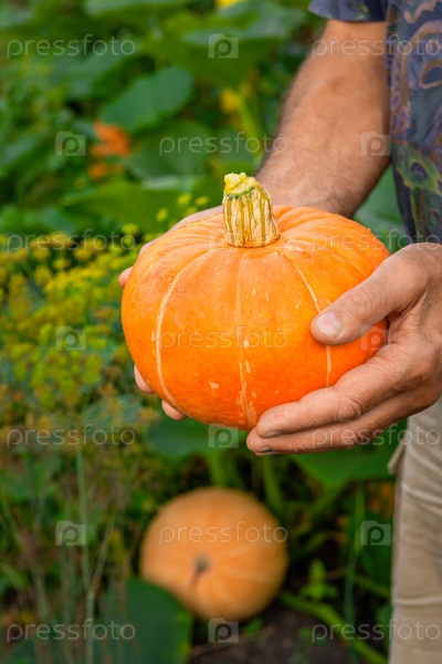 Мужчина держит тыкву. Подготовка к Хэллоуину. Урожай тыквы. тыква в руках человека на фоне зелени