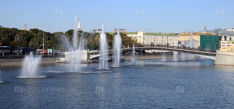 Много фонтанов на реке