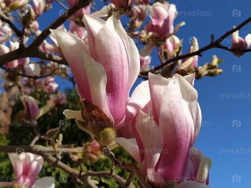 Красивые цветущие розовые цветы и бутоны магнолии на ветвях без листьев. Голубое небо и солнечный свет. Приглашение на свадьбу или открытка с 8 марта. Начало весны. Нежные белые лепестки