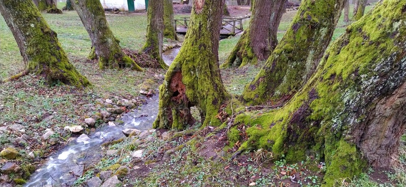 Стволы деревьев с мхом. Устье ручья или реки. Босния и Герцеговина, река Миляцка. Весенний лес на Балканах. Зеленый мох на дереве