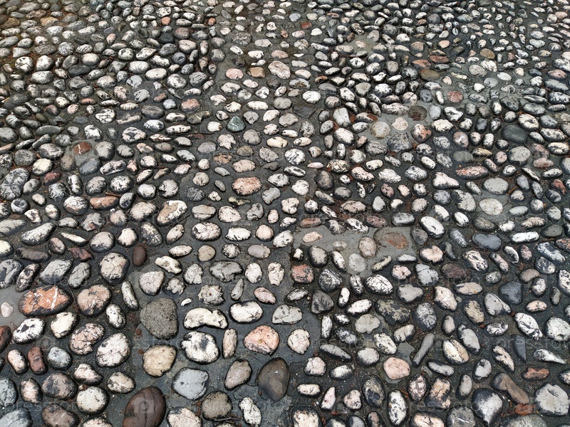 Брусчатка из круглых светлых камней, похожих на мрамор. Мощеная площадь в старом городе Сараево, Босния и Герцеговина. Красивые мокрые блестящие камни после дождя. Крупный план при естественном дневном свете