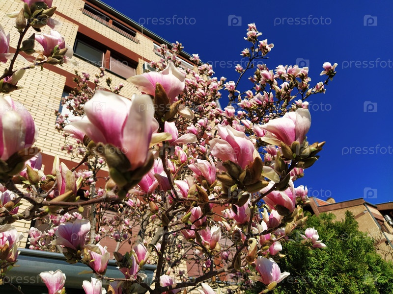 Красивые цветущие розовые цветы и бутоны магнолии на ветвях без листьев. Голубое небо и солнечный свет. Приглашение на свадьбу или открытка с 8 марта. Начало весны. Нежные белые лепестки