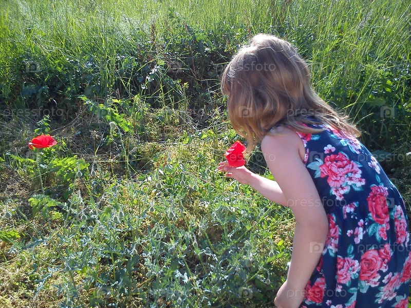 Девушка нюхает красные маки. Малыш с длинными светлыми волосами в красивом платье. Ребенок наклоняется над цветком. Луговые цветы. Концепция гармонии с природой