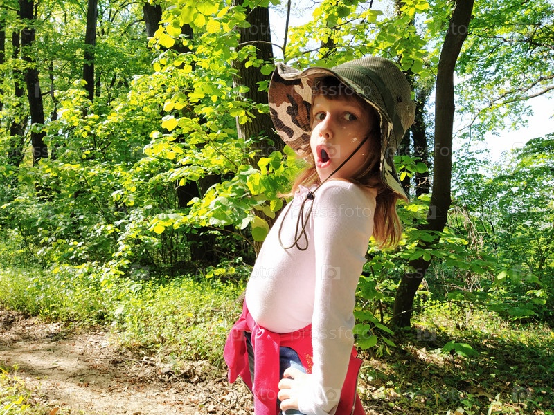 Красивая девочка 6 лет в охотничьей шляпе корчит гримасу на лице. Эмоции удивления, страха или разочарования. Ребенок оборачивается и смотрит в камеру. Лес на заднем плане