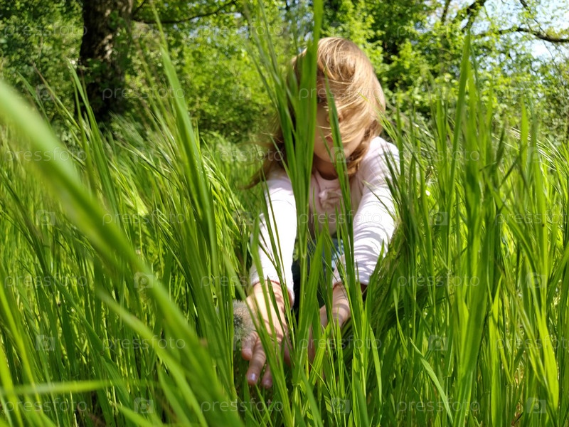 Милая девушка в зеленой траве. У ребенка светлые длинные волосы и белая блузка. Девушка разбрасывает руками высокую зеленую траву. Концепция экологии и гармонии с природой. Сезонная аллергия