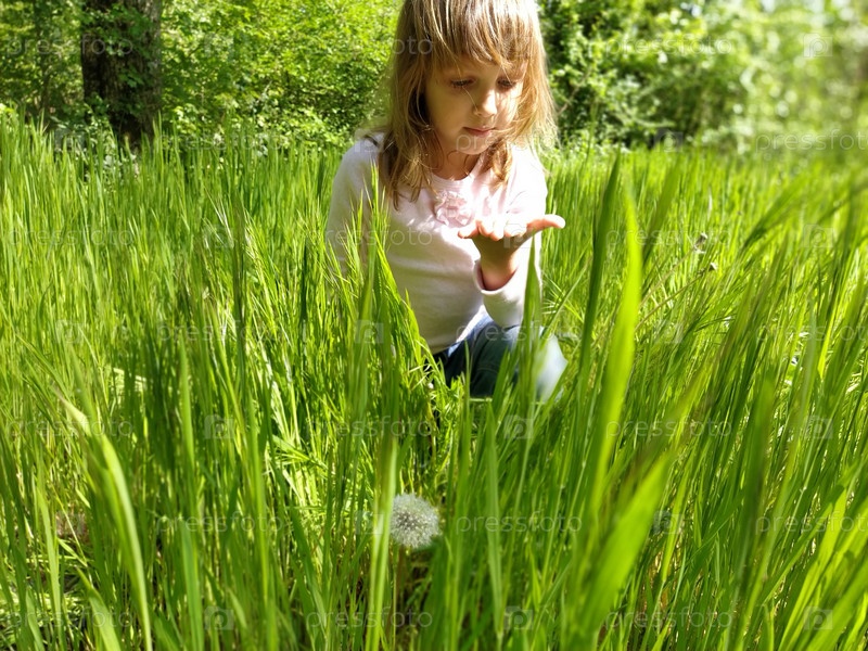 Загадочная девушка в зеленой траве. У ребенка светлые длинные волосы и белая блузка. Девушка смотрит на свою ладонь. Красочная фотография. Солнечная погода. Концепция гармонии с природой и забота об экологии. Здоровый образ жизни и органические продукты