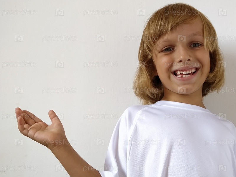 Маленькая милая девочка 6-7 лет со светлыми волосами выражает эмоциональную радость и улыбку на белом фоне. Ребенок с загорелой кожей. Белая футболка. Скопируйте пространство. Девушка рукой указывает на что-то