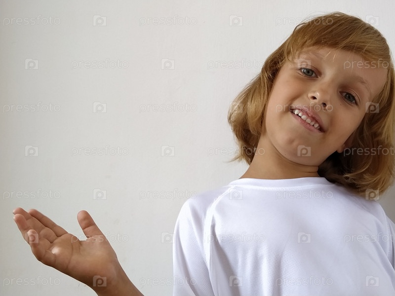 Маленькая милая девочка 6-7 лет со светлыми волосами выражает эмоциональную радость и улыбку на белом фоне. Ребенок с загорелой кожей. Белая футболка. Скопируйте пространство. Девушка рукой указывает на что-то
