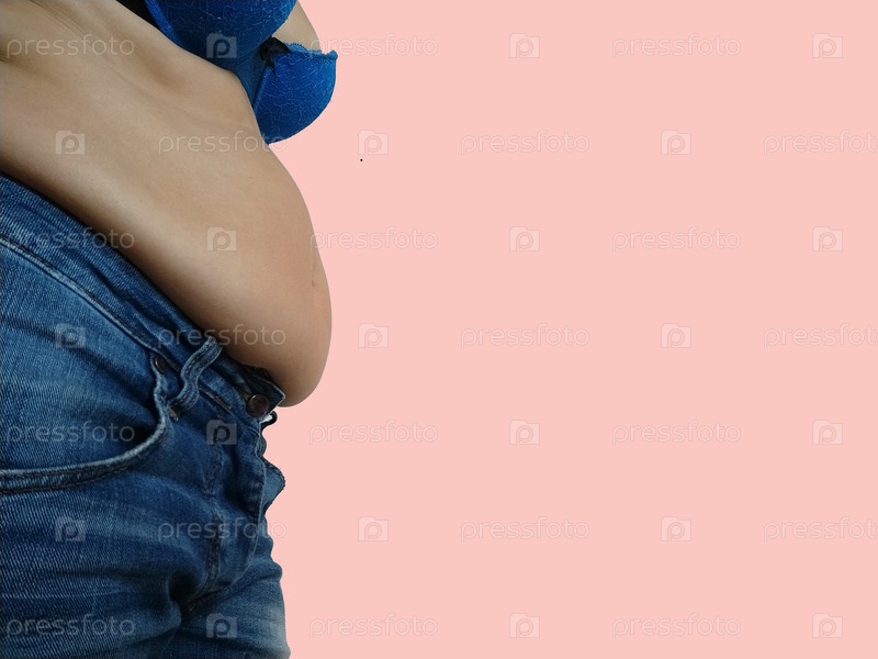 Обвисший живот. Складки кожи и жира по бокам нависают над талией джинсов. Фигура, испорченная перееданием или беременностью. Ожирение и диабет. Нездоровый образ жизни. Дряблые мышцы от целлюлита