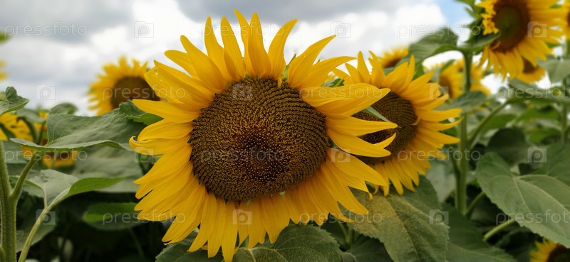 Поле цветущих подсолнухов. Красивые желтые крупные цветки с темной серединкой. Сельскохозяйственная концепция. Крупные зеленые листья с опавшей на них желтой пыльцой. Пейзаж или панорама