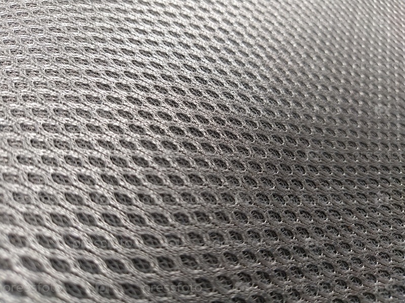 Абстрактная черная нейлоновая синтетическая ткань. Сетка из искусственной ткани серого цвета, устойчивая к загрязнениям. Фрагмент детского автокресла крупным планом. Мягкий фокус
