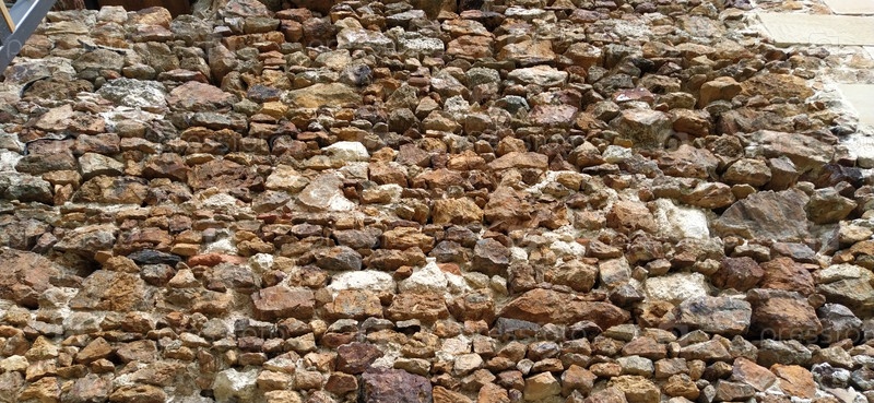 Каменная стена. Сложены крупные кирпичи и булыжники в теплых тонах. Рыхлые белые камни, выступающие над поверхностью стены