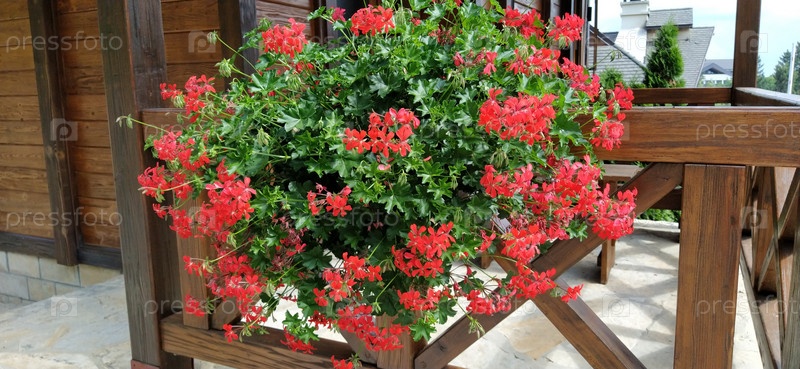 Красивые обильно цветущие красные плющевые герани пеларгонии на террасе или балконе. Деревянный забор или перила террасы из темного дерева