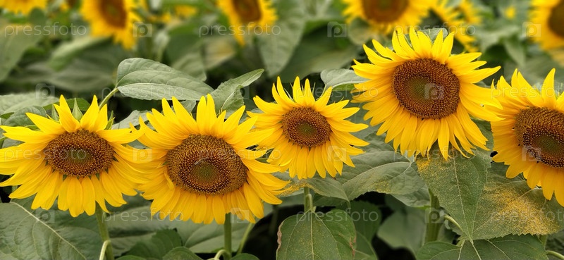 Поле цветущих подсолнухов. Красивые желтые крупные цветки с темной серединкой. Семена подсолнечника. Сельскохозяйственная концепция. Большие зеленые листья с опавшей на них желтой пыльцой