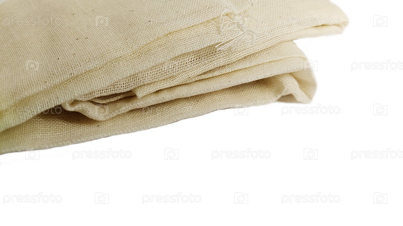 Фрагмент хлопчатобумажной ткани крупным планом. Косынка перевязочная из автомобильного комплекта скорой помощи. Переплетение нитей. Белый фон, изолировать