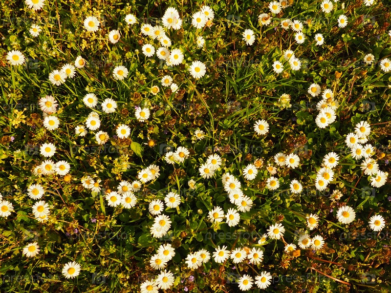 Белые цветы ромашки. Ромашковый газон, сфотографированный сверху в золотой час