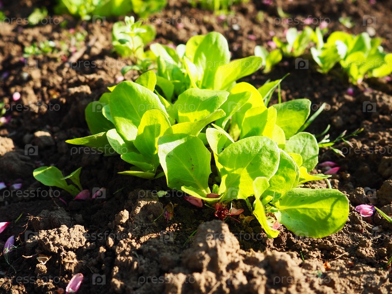 Салат бэби растет в поле. Свежие зеленые листья. Растениеводство и земледелие. Промышленное производство овощей на ферме