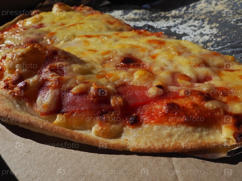 Пицца с помидорами и сыром в картонной коробке и алюминиевой фольге. Вкусная пицца крупным планом. Курьерская доставка еды на дом. Заказ пиццы. Традиционный итальянский круглый дрожжевой пирог с начинкой