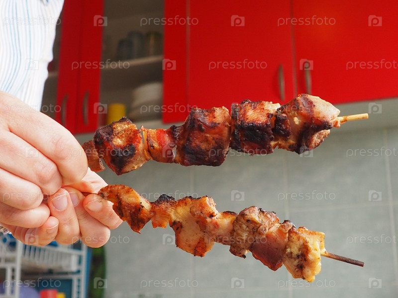 Мясо на гриле доставили из ресторана. Доставка на дом из ресторанов. Женские руки держат мясо на палочке. Кухня с красной мебелью. Чистота и безопасность пищевых продуктов