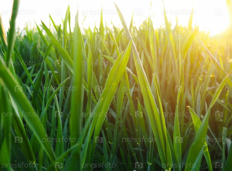 Трава или пшеница в солнечном свете. Поле с зеленой травой на восходе или закате золотисто-желтого солнца. Красота окружающей среды. Лучи света нежно окутывают растения. Весеннее лето в Сербии