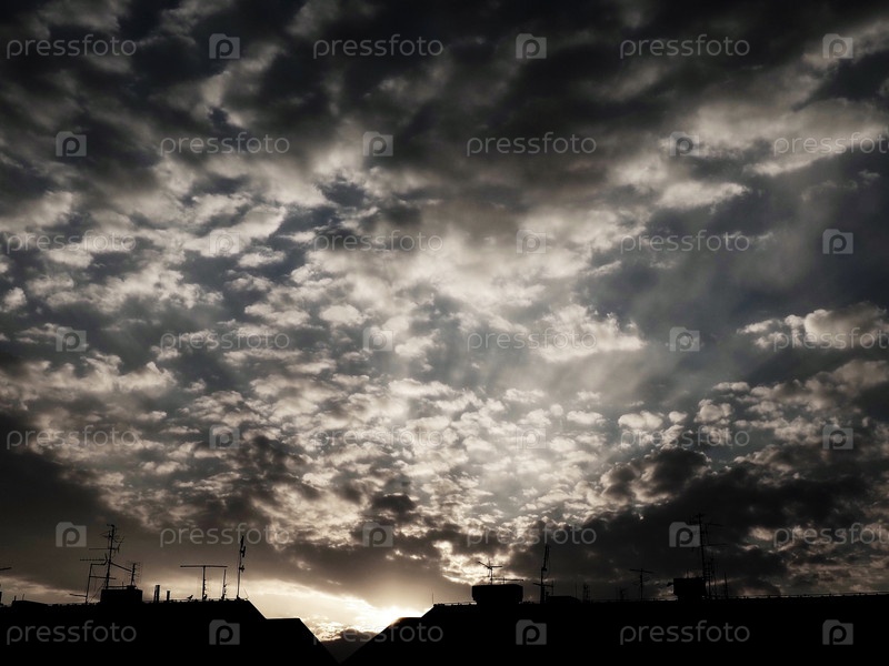 Закат или рассвет. Облака в вечернем или утреннем небе. Солнечные лучи. Красивый пейзаж. Черно-белая монохромная фотография в стиле ретро или винтаж. Повышенный уровень фотошума как художественный трюк