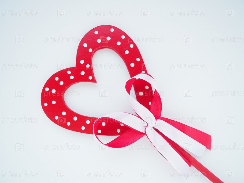 Концепция дня святого Валентина. Красное деревянное сердце с белыми точками и ленточным бантом на палочке. Белый фон. Красивый бант в качестве украшения. Любовь и отношения. Признание или поздравления