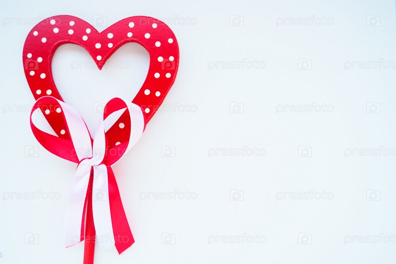 Концепция дня святого Валентина. Красное деревянное сердце с белыми точками и ленточным бантом на палочке. Белый фон. Красивый бант в качестве украшения. Любовь и отношения. Признание или поздравления