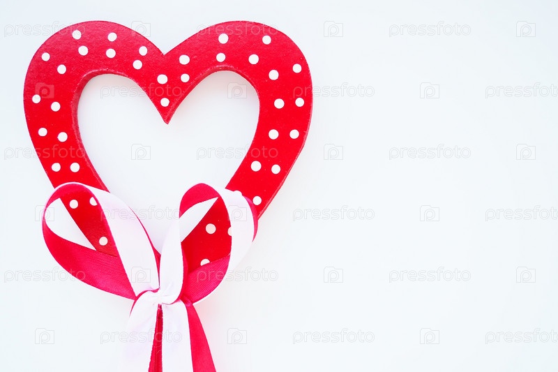 Концепция дня святого Валентина. Красное деревянное сердце с белыми точками и ленточным бантом на палочке. Белый фон. Красивый бант в качестве украшения. Любовь и отношения. Признание или поздравление