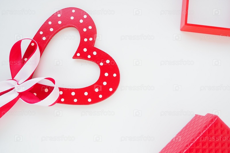 Концепция дня святого Валентина. Красное деревянное сердце с белыми точками и ленточным бантом на палочке. Красная подарочная коробка и фоторамка. Белый фон. Плоская укладка. Скопируйте пространство