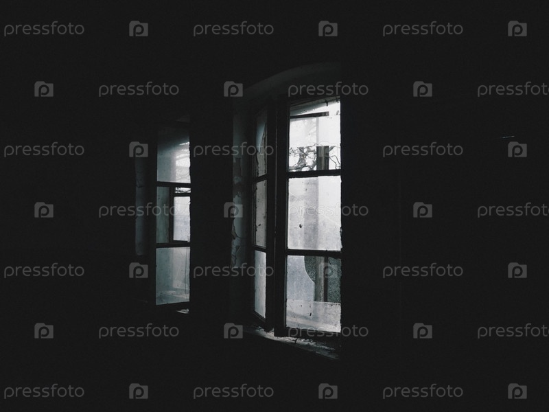 Страшные окна. Внутри заброшенного дома. Вид разбитых окон без занавески. Гранж сцена. Свет сияет сквозь старые деревянные рамы с битым стеклом. Концепция заброшенности и бесполезности