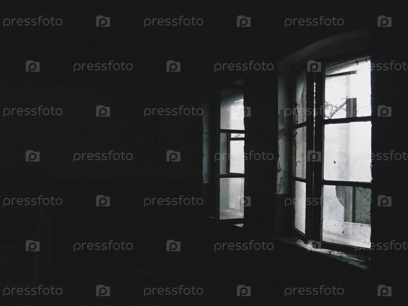 Страшные окна. Внутри заброшенного дома. Вид разбитых окон без занавески. Гранж сцена. Свет сияет сквозь старые деревянные рамы с битым стеклом. Концепция заброшенности и бесполезности
