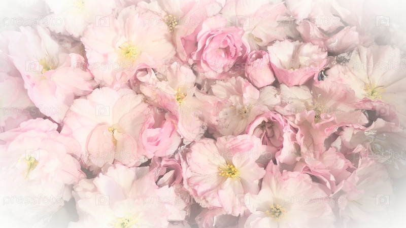 Розовые цветы вишни сакуры фон. Цветочная стена. Мягкий выборочный фокус. Праздничная открытка. Розовые лепестки и желтые тычинки. Красивый фон. Белая виньетка. Размытое искусство. Весенний вишневый цвет