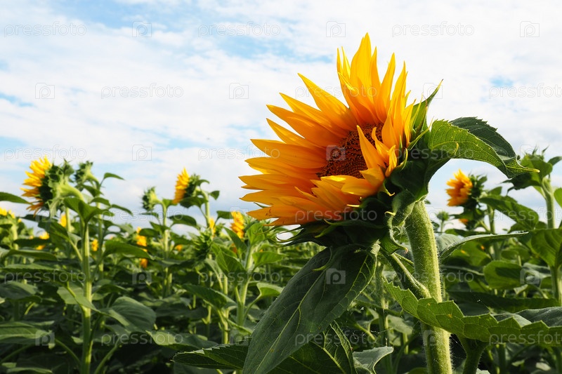 Подсолнечник Helianthus род растений семейства сложноцветных. однолетний и клубневый подсолнечник. сельскохозяйственное поле. цветущий бутон с желтыми листьями. пушистые листья. Горизонт Сербии